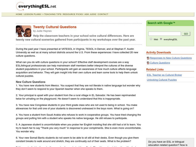 These are different scenarios that teachers might have to confront with their ESL students. Help the professionals at your school understand the diverse cultures of your students. It offers downloads and resources. Great for staff...