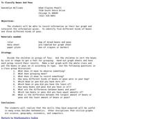 First graders record information on a bar graph and interpret the information given. They identify five different kinds of beans and three different kinds of peas. They work in groups of four and sort the beans by size or shape.