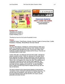 Accompany a reading of First Come the Zebra written and illustrated by Lynne Barasch with a teacher's guide equipped with before reading, vocabulary, and after reading activities. Additional social studies,...