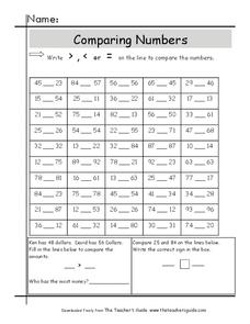 Have your budding math analysts compare numbers up to 100. Here are 2 worksheets that each include 60 problems where learners use the appropriate symbol to determine which number is greater than, less than, or equal. An answer key for...