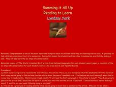 Students discuss the importance of comprehension and the use of summarization. Through guided practice, they follow five steps in finding and highlighting important information, while deleting information that is not needed. Using the...