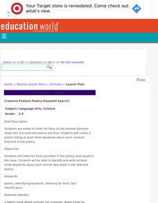 Students examine the differences between fact and opinion, and brainstorm ideas for a keyword list by analyzing facts. They listen to poems, and create posters listing three keywords about each creature featured in the poetry.