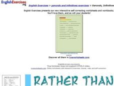 In this English worksheet, students use gerunds and infinitives. Kids insert to or rather than to complete sentences. The students indicate whether gerunds, infinitives, bare infinitives, or nouns are being used in sentences.