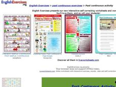 In this past continuous learning exercise, students write verbs to label pictures, choose the correct words for sentences describing after school and in school. Students complete 3 activities.