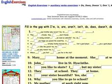 In this gap fill worksheet, students fill in the blanks to sentences with do, does, doesn't, don't, am, is, are, or I'm. Students complete 45 sentences.