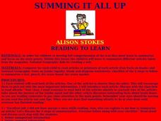 Students read articles and summarize the main points in this lesson. Students read a provided article from National Geographic Kids and create a web detailing the main points. They then use a six step process to write a summary of the...