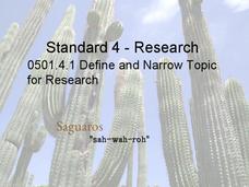 This research PowerPoint provides questions to consider when selecting a research topic. Emerging writers consider their purpose for writing and the audience they are writing for, and then practice narrowing down a topic given a list of...