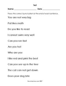 In this punctuation worksheet, students insert the correct punctuation at the end of 11 simple sentences. Sentences are interrogatives and declaratives.