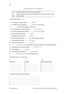 In this prepositions of time worksheet, students fill in the blanks to sentences with either the word at, in, or on. Students fill in 15 sentences write 4 on their own, and fill in a chart for 4 blanks for each word..