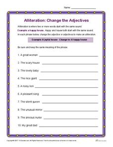 Work on a wonderful worksheet this Wednesday! Elementary scholars read ten pairs of adjective and noun pairs, and choose a synonym for each adjective to create an alliteration.