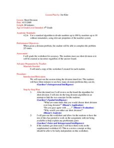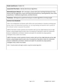 Show classes how to work their way through the algorithms. The long division lesson plan shows five algorithms in dividing multi-digit numbers by a single digit. The algorithms include partial quotients, stacking method, place value long...