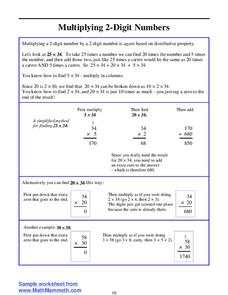 In this multiplying 2-digit numbers worksheet, students solve and complete 4 different problems. First, they multiply by the right-bottom digit and then the left-bottom digit. Finally, they add all numbers together and write the answer.