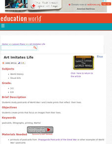 Elementary and middle schoolers examine postcards depicting World War I events. Eventually, they create prints that reflect their own lives. In an interesting blend of history and current events, this lesson should engage your kids in...