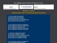 In this ESL grammar-passives activity, students complete 10 multiple choice questions, choosing phrases that best complete sentences. A website reference for additional resources is given.