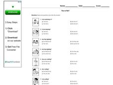 In this ESL yes/no questions worksheet, students study 7 pictures that depict people in action. Students choose from 4 answers to respond to a question about each picture.