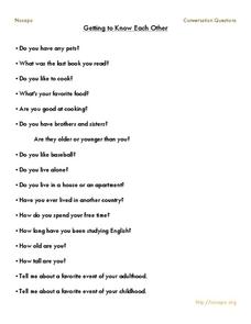 How do you do? Guide learners through the basics of conversational English with an extensive set of discussion questions. Class members ask partners more about themselves, including their favorite hobbies, music, and time of day, as well...