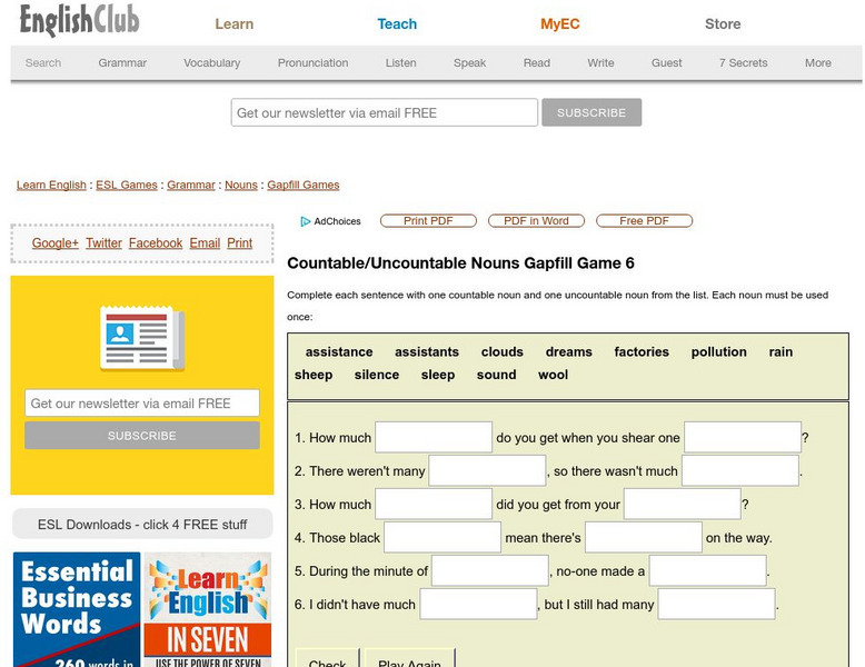 English Club: Countable/uncountable Nouns Gapfill Game 8