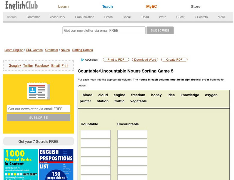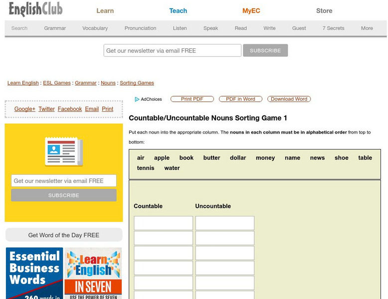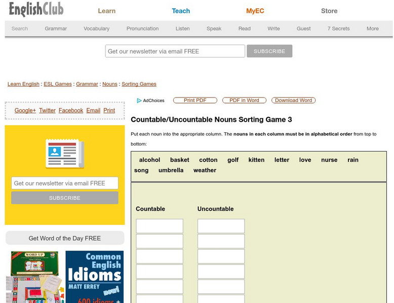 In this game, students sort the words into countable and uncountable noun categories and place them in the columns in alphabetical order from top to bottom.