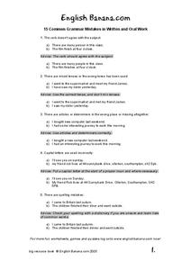 In this grammar worksheet, students will read 5 of the 15 most common grammatical errors in written and oral work. There are 2 examples of each mistake and 2 examples of the corrected mistake.