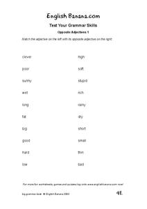 For this grammar worksheet, students will demonstrate a mastery of adjectives and their opposites. Students will match ten adjectives in one column to their antonyms in the opposite column.