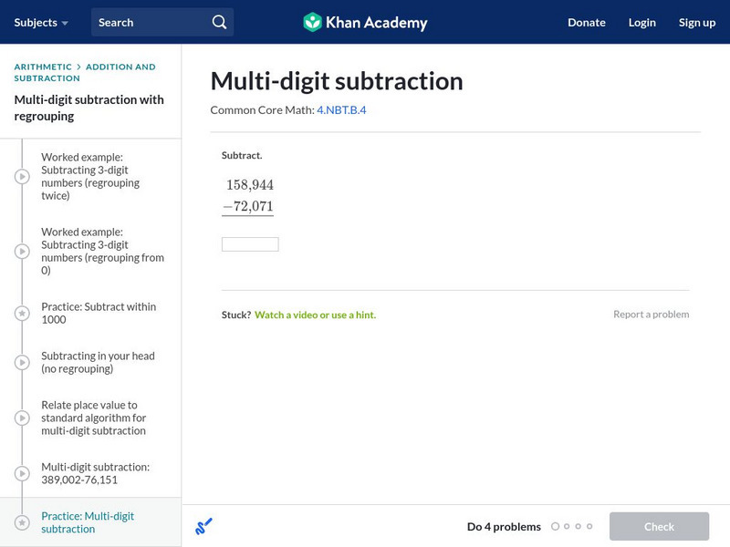 Subtract with 2 numbers less than 1000. Students receive immediate feedback and have the opportunity to try questions repeatedly, watch a video or receive hints.