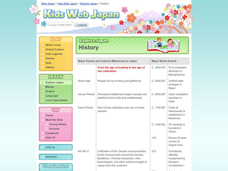 Check out this chart detailing the major historic events in Japan from its Stone Age beginnings to 2005. There is a column on the chart that shows major world events also for comparison.