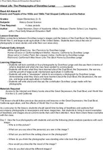 Students use art to analyze a period in history. In this lesson about the effect of art on history, students study many different pieces of photography by Dorothea Lange. Students will observe photographs from certain time periods and...