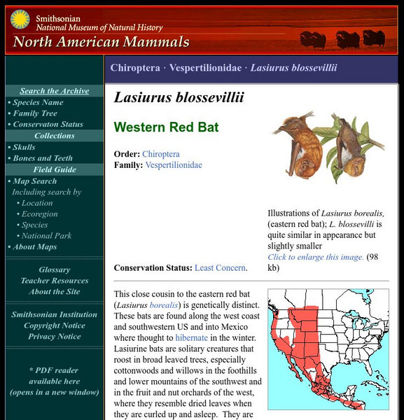 This close cousin to the eastern red bat (Lasiurus borealis) is genetically distinct. These bats are found along the west coast and the southwestern US and into Mexico where they are thought to hibernate in the winter. Learn more about...