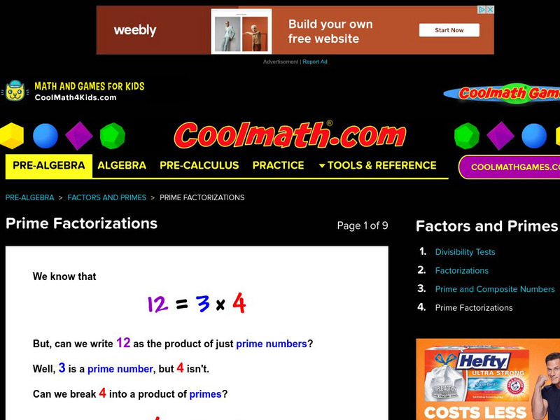 This site is an interactive quiz which provides students with a prime factorization problem. Students input their solution and have the program evaluate it. Hints are available if the student needs them, and explanations are provided...