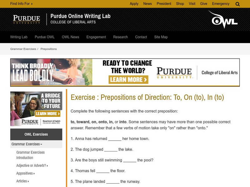 This Purdue University OWL (Online Writing Lab) provides practice with prepositions of directions (to, on, onto, in, into).