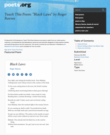 After investigating the Black Lives Matter movement, class members do a close read of Roger Reeves' "Black Laws." They write down words and phrases that rhyme, consider the kinds of rhymes used and their function in the poem. Scholars...