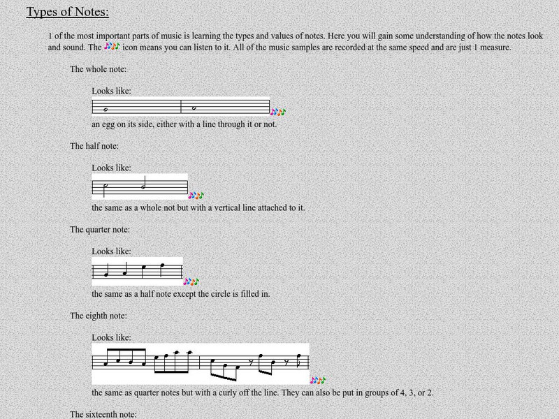 Learn about the different types of notes in music--the whole note, half note, quarter notes, eighth note, and sixteenth note--and listen to midi files of music samples.