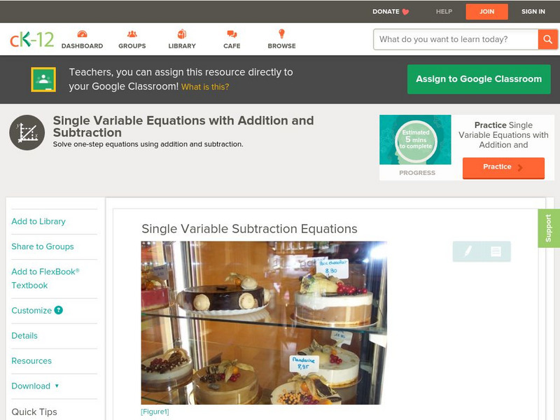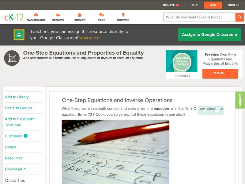 [Free Registration/Login may be required to access all resource tools.] In this lesson students learn how to solve one-step equations. Students examine guided notes, review guided practice, watch instructional videos and attempt practice...