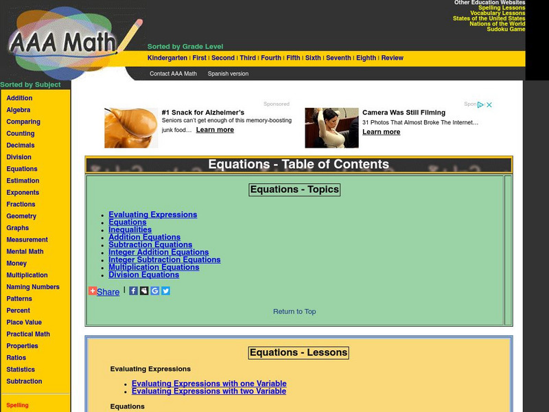 Test your algebra aptitude at this colorful website filled with algebra assignments for upper elementary and middle school students. Assignments explore algebra concepts using addition, subtraction, multiplication, fractions, division,...