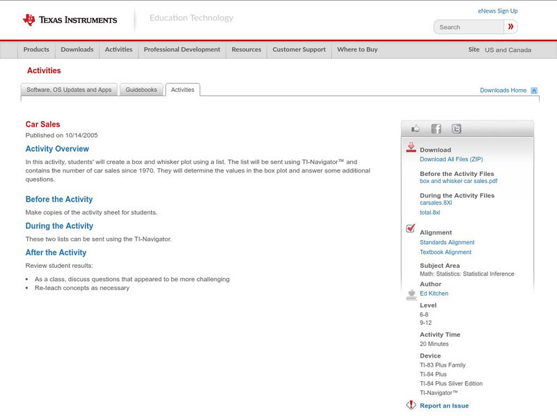 In this activity, students will create a box and whisker plot using a list. The list will be sent using TI-Navigator and contains the number of car sales since 1970. They will determine the values in the box plot and answer some...