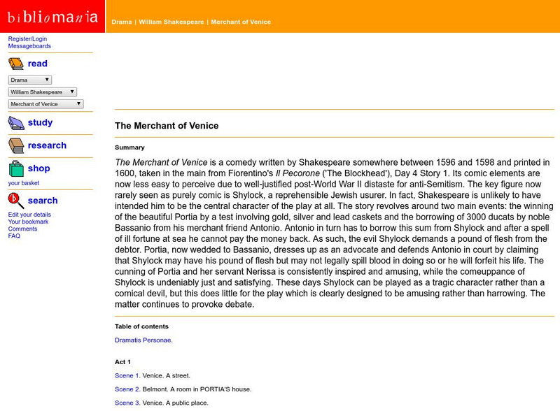 This website provides the full text of Shakespeare's play, "The Merchant of Venice." The text, which is organized by scene, is accompanied by a brief introduction with an overview of the play's "Comic elements," and its plot and characters.