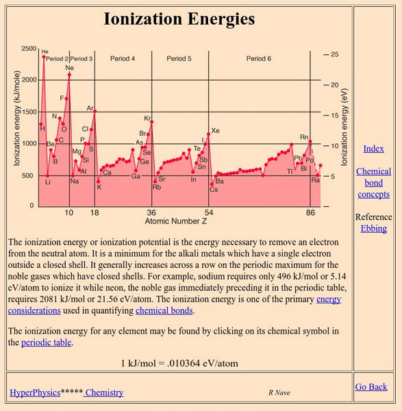 A concise description of ionization energy, and a line graph that plots the ionization energies of the first 88 elements vs. the atomic numbers.