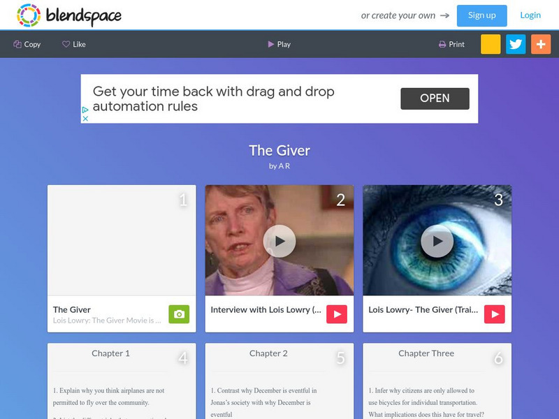 This blendspace includes thirty-two spaces with content connected to Lois Lowry's dystopia novel, The Giver. Links include novel discussion questions, author interviews, and video tutorials to review literary topics.