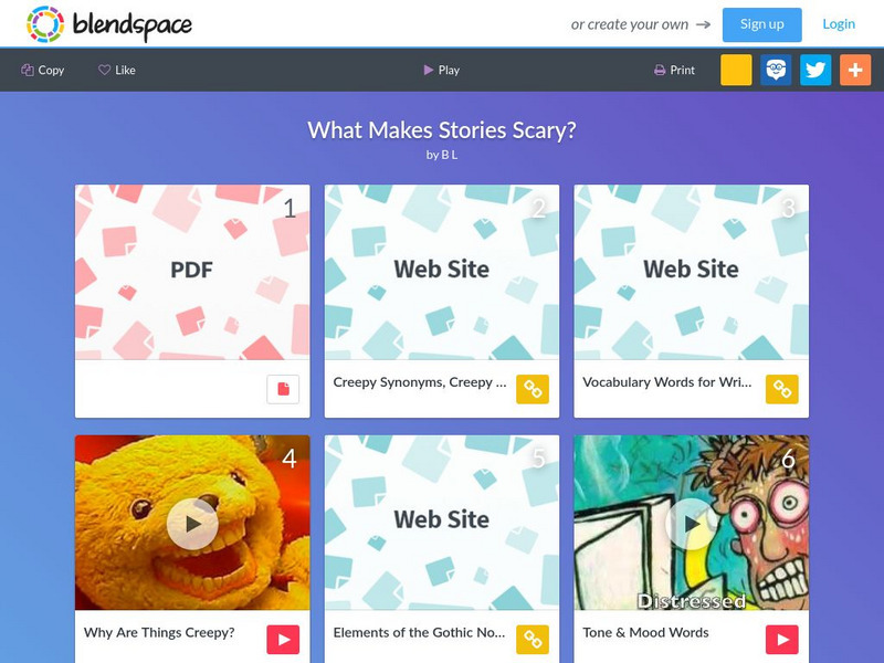 A learning module that includes fourteen links to websites, videos, and activities on writing scary stories. Lessons focus on vocabulary, plot and character development, elements of gothic stories, tone and mood, suspense, and more.