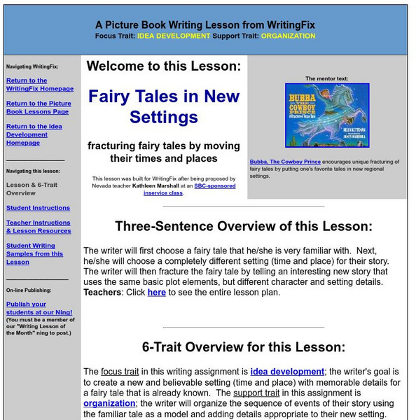 After reading Bubba, The Cowboy Prince by Helen Ketteman, the writer will first choose a fairy tale that he/she is very familiar with. Next, he/she will choose a completely different setting (time and place) for their story. The writer...