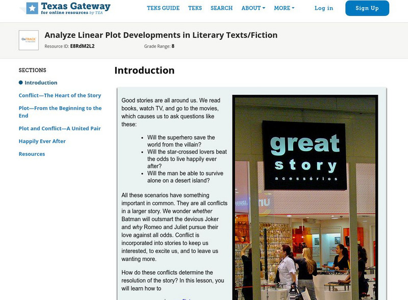[Accessible by TX Educators. Free Registration/Login Required] This lesson focuses on how conflicts determine the resolution of the story. In this lesson, students learn how to recognize conflict, analyze linear plot, and determine how...