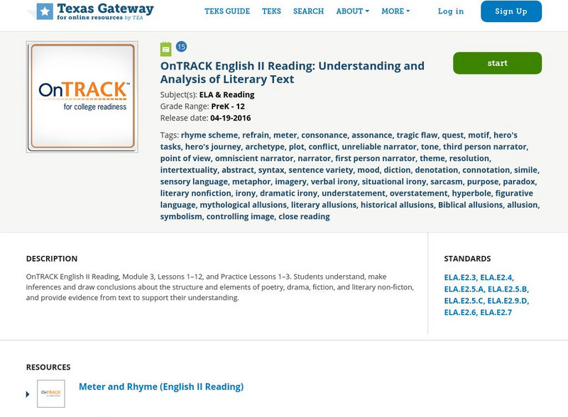 OnTRACK English II Reading, Module 3, Lessons 1-12, and Practice Lessons 1-3. Students understand, make inferences and draw conclusions about the structure and elements of poetry, drama, fiction, and literary non-fiction, and provide...