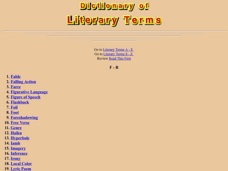 The second of three pages of simple definitions for literary terms. This page, F - R, covers forty-seven terms from "Fable," to "Romance."