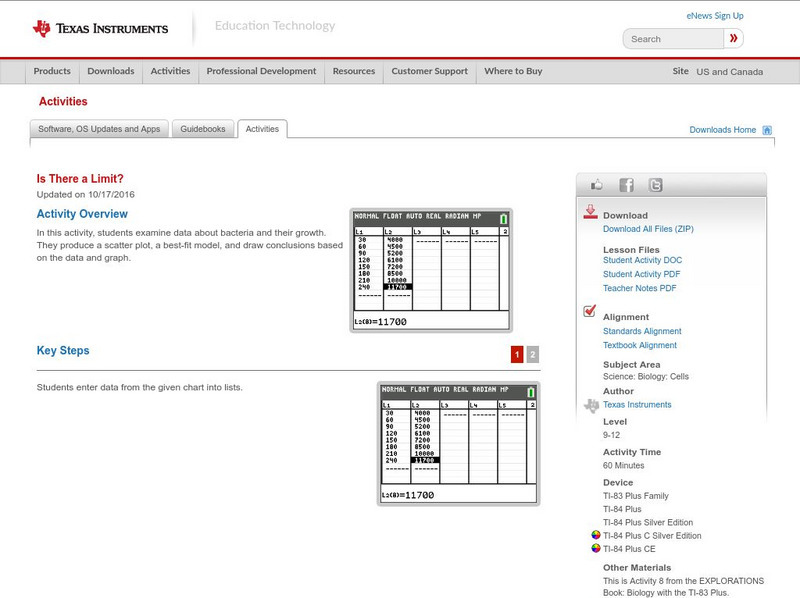 In this activity, students examine data about bacteria and their growth. They produce a scatter plot, a best-fit model, and draw conclusions based on the data and graph.