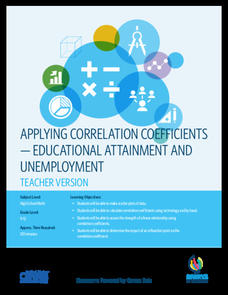 Correlate education with unemployment rates. Individuals compare state and regional unemployment rates with education levels by calculating the correlation coefficient and analyzing scatter plots. Pupils begin by looking at regional data...