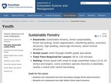 High schoolers evaluate a forest for timber harvest and discuss potential impacts of logging. In this sustainable forestry lesson, they work in groups in a forested plot to choose trees to cut based on species and stem diameter and then...