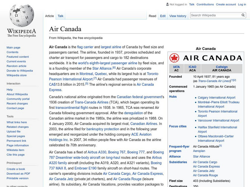 Air Canada is Canada's largest airline carrier. Founded in 1937, its history and expansion are traced on this site.