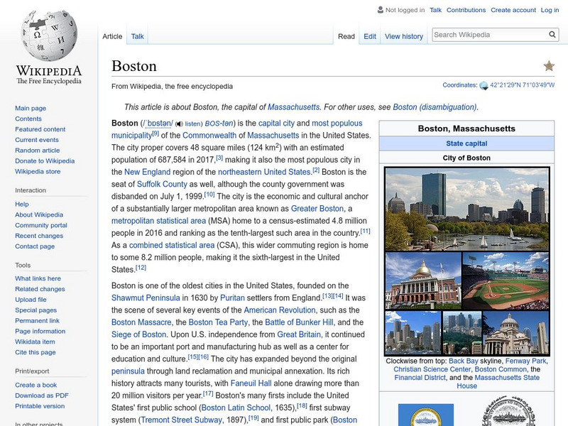 Wikipedia offers extensive information about the city of Boston. Read about its history, geography, government, and demographics. There are many links included containing information on related topics.