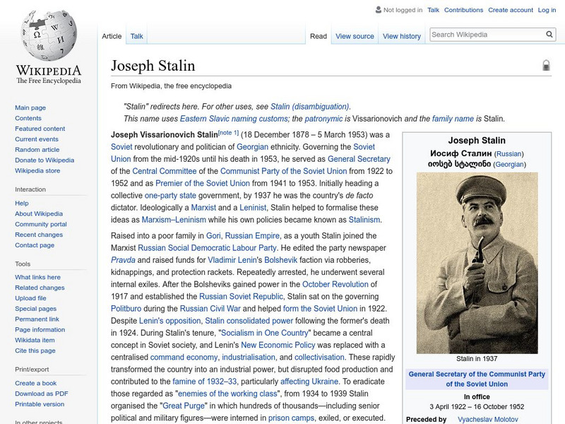 An in-depth biography of former Soviet leader Joseph Stalin. Content includes information on his childhood and early years, his rise to power after Lenin's death, his policy of collectivisation, his consolidation of absolute power by the...