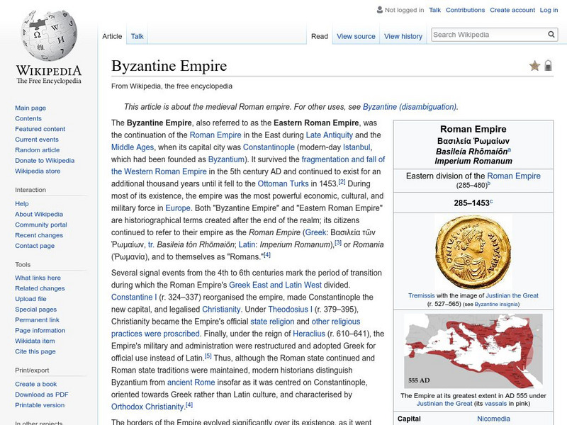 Wikipedia entry on the Byzantine Empire addresses its history, the split with Rome, invasions and migrations from the East, its culture, and the empire's eventual decline and fall.